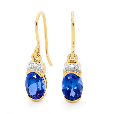 9ct yellow gold created Sapphire and Diamond shepherd hook earrings.