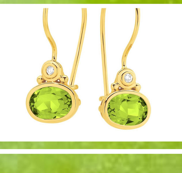 9ct yellow gold Peridot & Diamond shepherd hook earrings. Featuring two 7 x 5mm oval Peridot with total diamond weight 0.03ct bezel set Diamonds (JKL SI3).