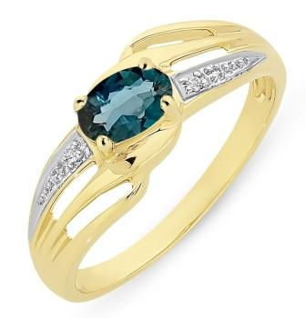 9ct yellow gold London Blue Topaz & Diamond ring. Size "O" currently in stock.