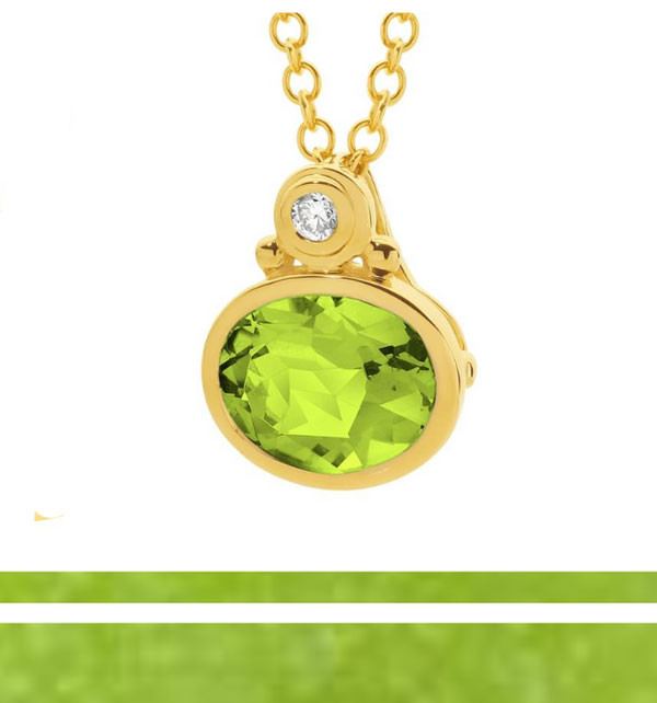 9ct yellow gold Peridot & Diamond pendant. Featuring a 8 x 6mm oval bezel set Peridot with total diamond weight 0.02ct bezel set Diamonds (JK SI3).