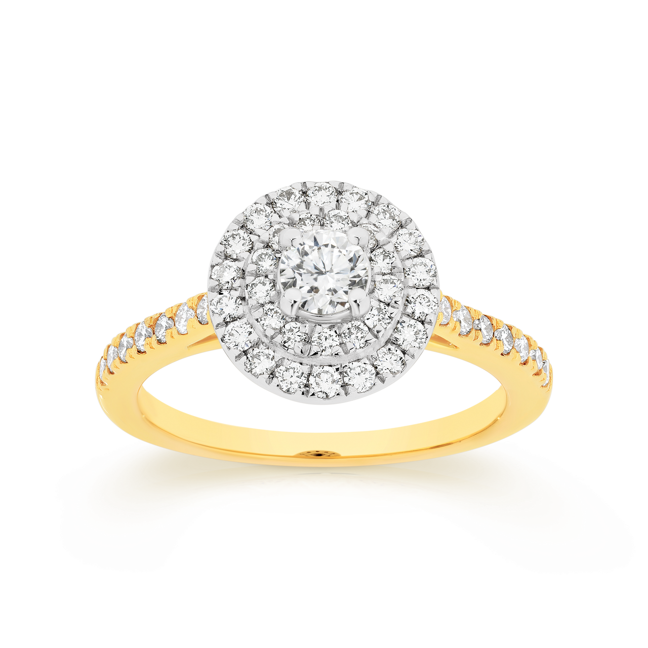 Loading... Please wait...18ct yellow gold 0.30ct round brilliant cut centre Diamond, double Diamond halo ring with shoulder set Diamonds. Total Diamond Weight = 0.85ct (IJ/P1). Currently available in size "N".