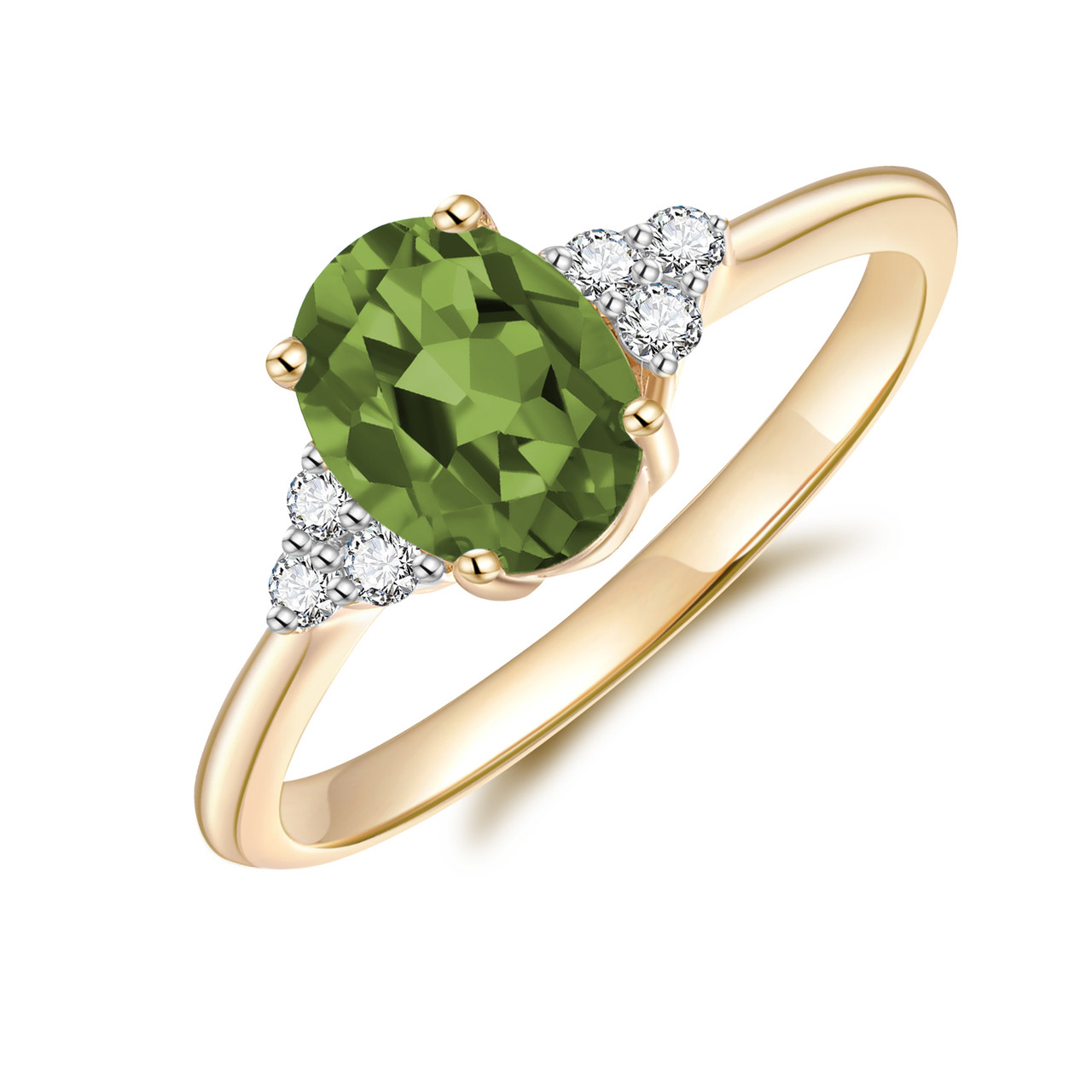Loading... Please wait...9ct yellow gold claw set 8mm x 6mm oval Peridot and 6x round Diamond ring featuring total diamond weight of 0.13ct (GH/I1-2). Currently available in size "O".