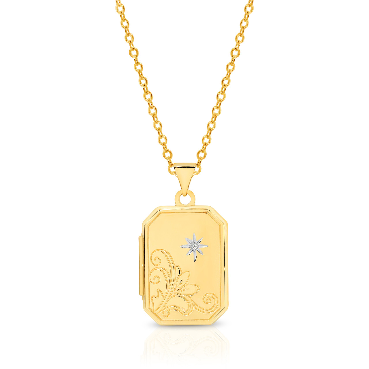 Loading... Please wait...9ct yellow gold rectangle shaped (20mmx14mm) Diamond set locket featuring a total diamond weight of 0.005ct (H, I2). Chain sold seperately.