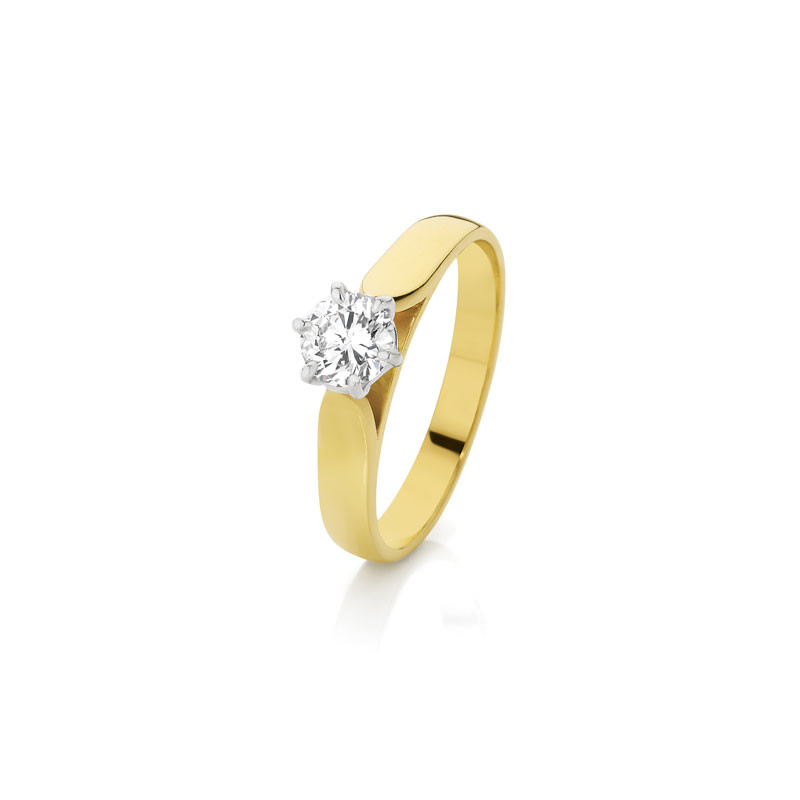 Loading... Please wait...Classic solitaire ring in 18K yellow gold featuring a 0.53 carat Bluefire 144 Diamond, H colour and VVS2 clarity (B58). Current size in stock "M 1/2".
