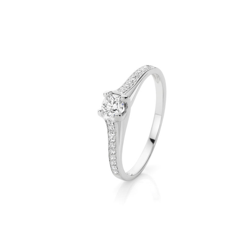 Loading... Please wait...18K white gold ring featuring a 0.26 carat Bluefire 144 Diamond, G colour and SI-1 clarity centre stone together with 20 round diamonds. TDW = 0.41ct (B114). Current size in stock "P".