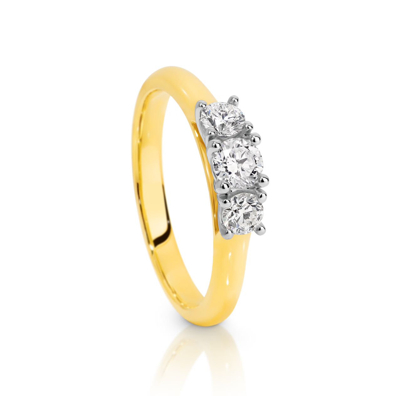 Loading... Please wait...18ct yellow gold ring with Diamonds from the Argyle mine. This trilogy ring featuring a total diamond weight of 0.63ct (HI/P1). Currently available in a size "P".