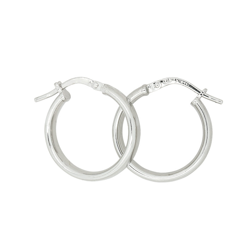 Loading... Please wait...9ct white gold, silver filled, plain polished hoop earrings with a 15mm inside diameter.