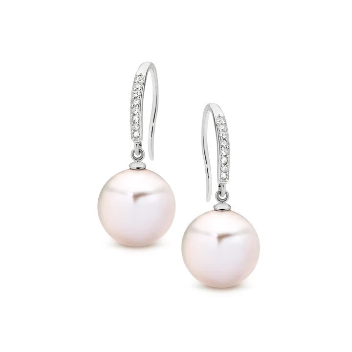 Loading... Please wait...Twilight Luminescence earrings. Sterling silver 11.5mm white round Edison Freshwater Pearl and Cubic Zirconia hook earrings.