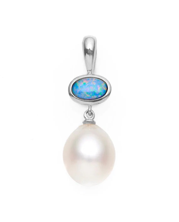 Loading... Please wait...Sterling silver light solid oval Opal (4x6mm) pendant featuring a 9mm white Freshwater Pearl. Chains sold seperately.