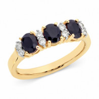 Loading... Please wait...9ct yellow gold Sapphire and Diamond ring featuring three 5mm x 4mm clawset oval sapphires = 1.40ct and eight Diamonds with a total diamond weight of 0.18ct (JKL, SI3). Size "N" currently available.