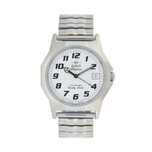 Loading... Please wait...The Adina Countrymaster Work Watch NK150 S1FE-SAP is an icon in the Adina Collection. This workhorse has a reputation to be envied! The easily read white full figured dial is highlighted in the robust nickel free all stainless steel case and easy fitting and wearing expanding band. This watch is designed to be worked in and worn every day including swimming and showering being 10ATM water resistant. Watch operation is simple through the Bi-oring crown and the Swiss Made movement is protected behind a tough sapphire crystal glass.