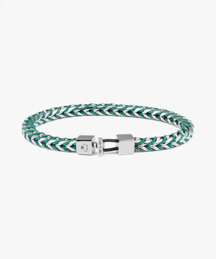 Loading... Please wait...Pig & Hen Catena Foxtail Stainless Steel Marine Rope Patina Green Silver bracelet. Width: 5mm; Rope type: chain; Shackle colour: silver; Shackle size: 8mm; Shackle type: T-shackle; Large 20cm.