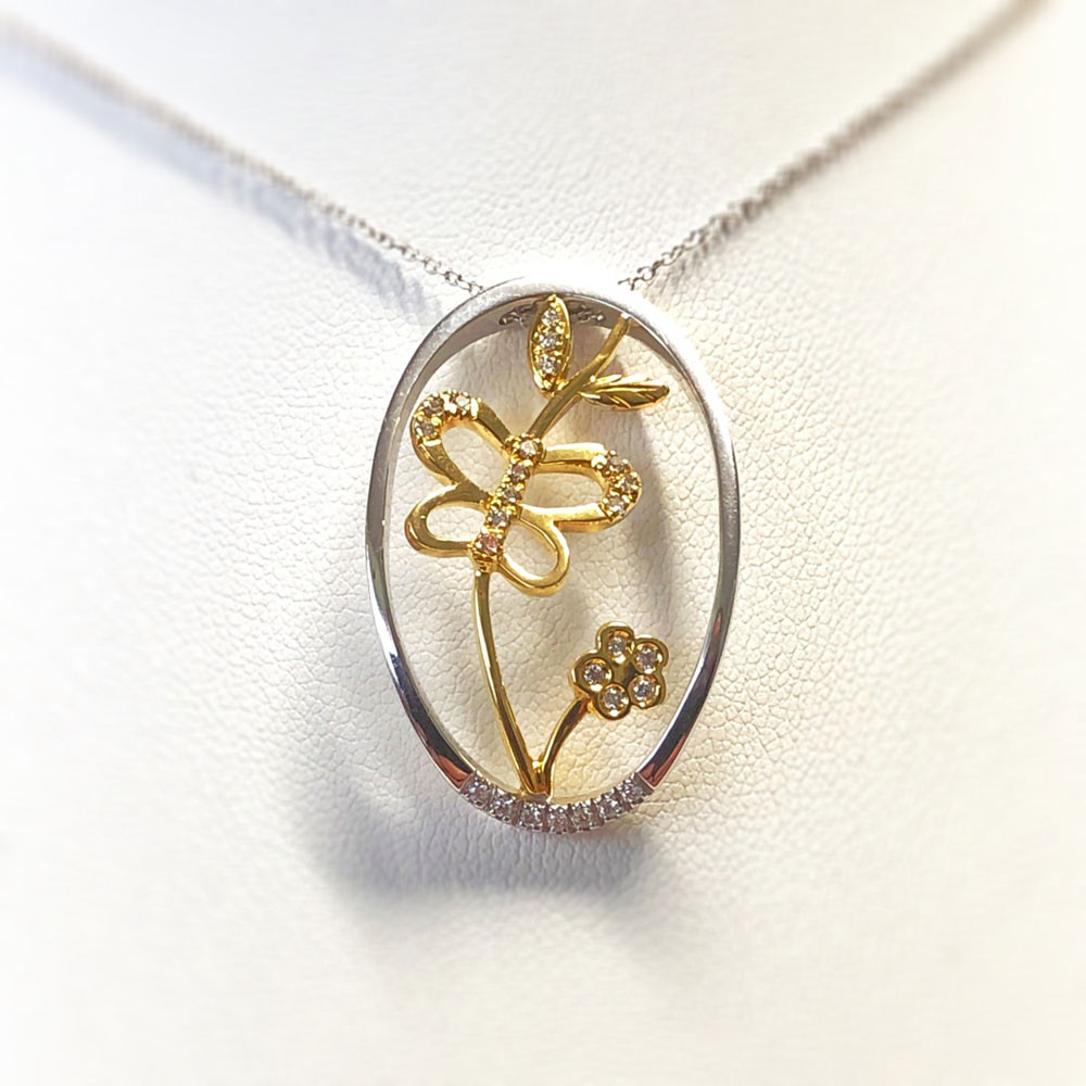 Loading... Please wait...18ct yellow & white gold butterfly and flower Diamond set pendant together with an 18ct white gold chain. Features 26 Diamonds with a total diamond weight of 0.18ct.