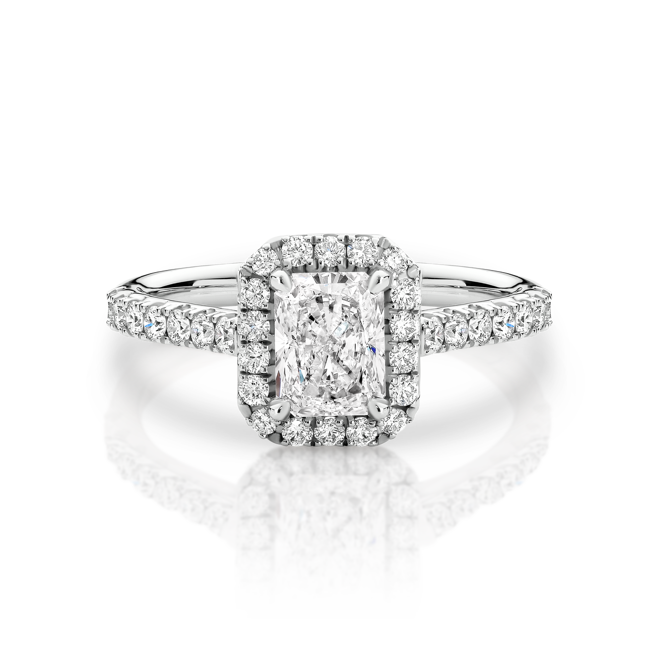 Loading... Please wait...Listen to your heart.... 18ct white gold diamond long radiant halo ring total diamond weight ("TDW") = 1.48ct.